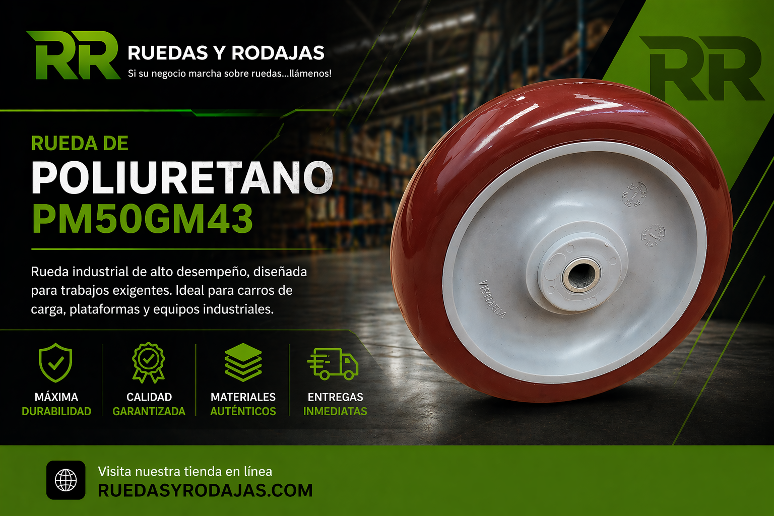En Ruedas y Rodajas ofrecemos ruedas de poliuretano de alta calidad para aplicaciones industriales, comerciales y de manufactura en todo México. Contamos con modelos que resisten y son durables como las ruedas de poliuretano marrón PM50GM43, PM40GM43, PM30GM43 ideales para operaciones de carga, y movimiento de materiales para trabajo constante en almacenes y líneas de producción. Realizamos entregas en Querétaro, Guadalajara, Monterrey, Aguascalientes, Saltillo, CDMX y todo México con atención especial para la industria.